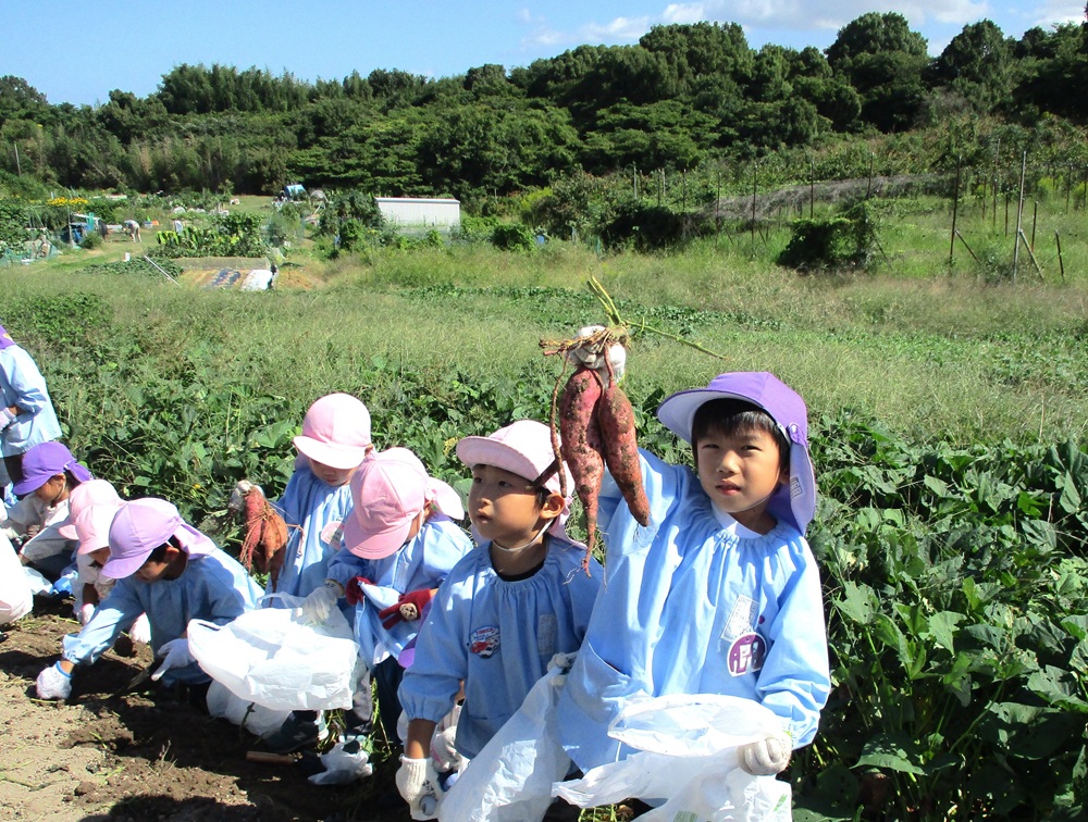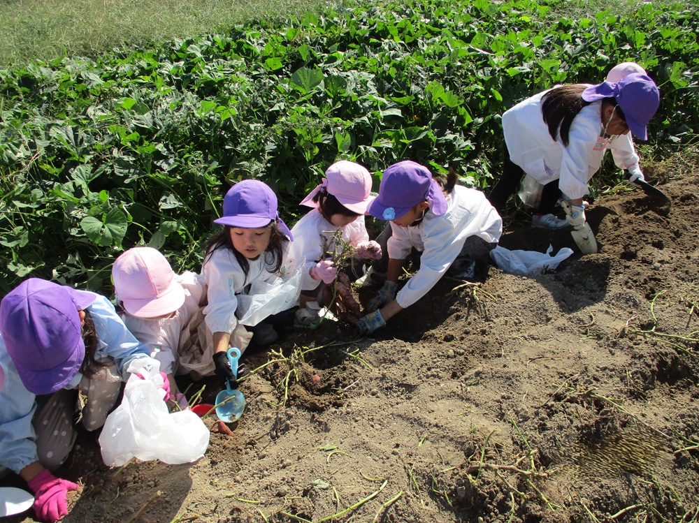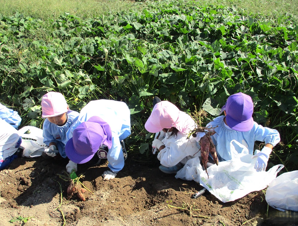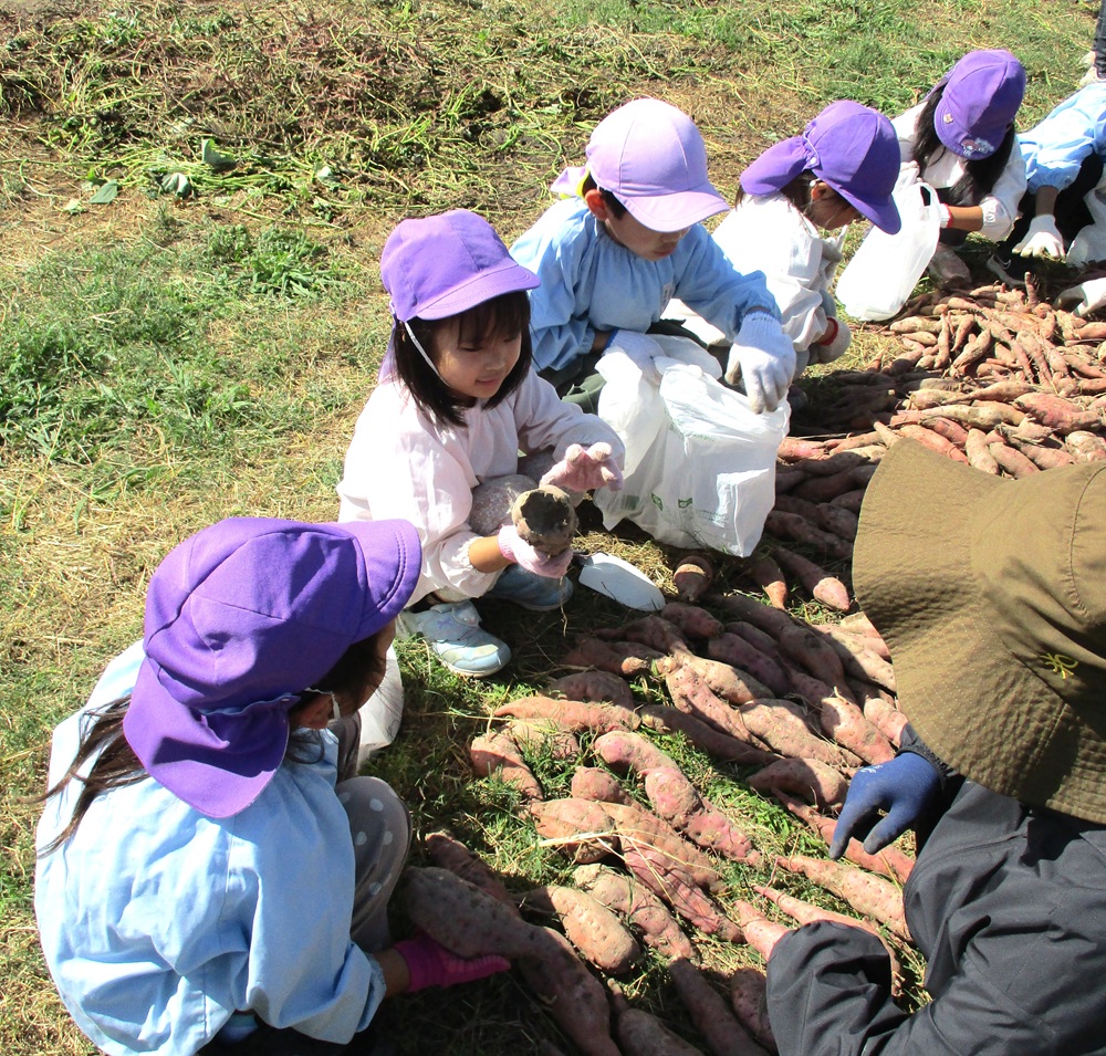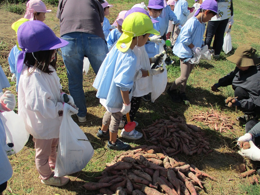 約1時間近く、夢中でいもほりを体験することができ、みんなで収穫したおいもは、各自で選りすぐりながらレジ袋に入れ「重たいよ~」とうれしい悲鳴をあげながら、持ち帰りました。