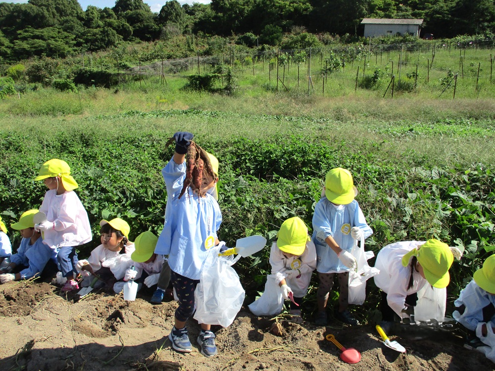 「どこにあるん?」「あっ、おいもが見えてる」と思い思いにスコップで掘っていく子どもたち。つるを引っ張ってしりもちをついたり、力を入れ過ぎてスコップが曲がってしまったり・・・苦戦しながらも「見て!」「こんなにいっぱい」と掘り出したおいもを掲げ、誇らしげな表情があちらこちらで見られるようになりました。