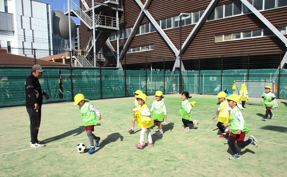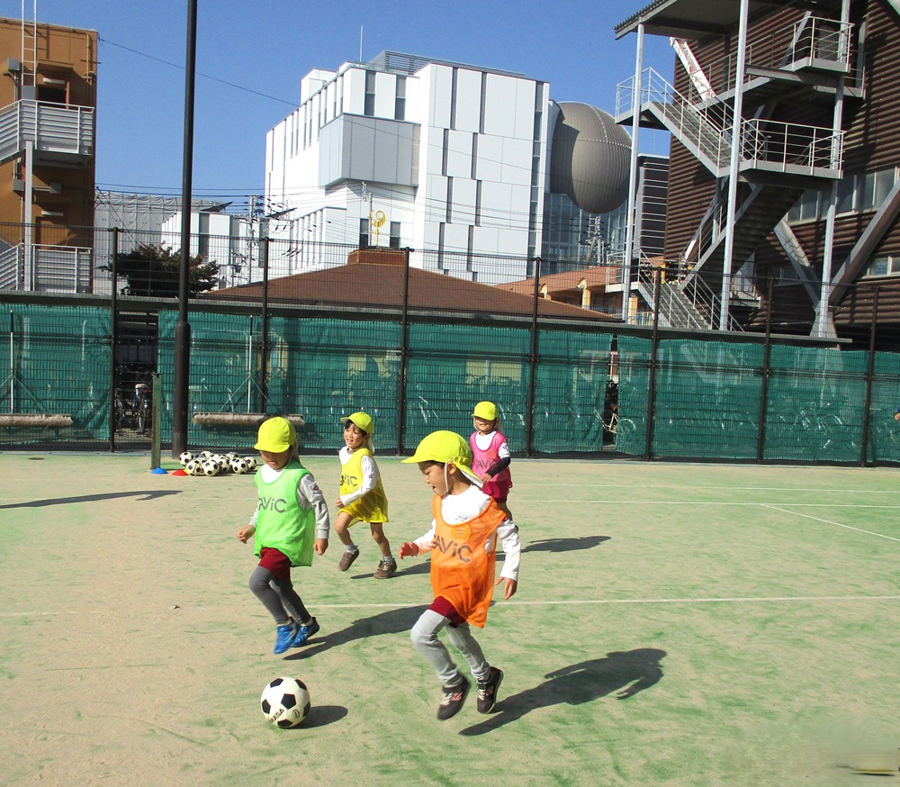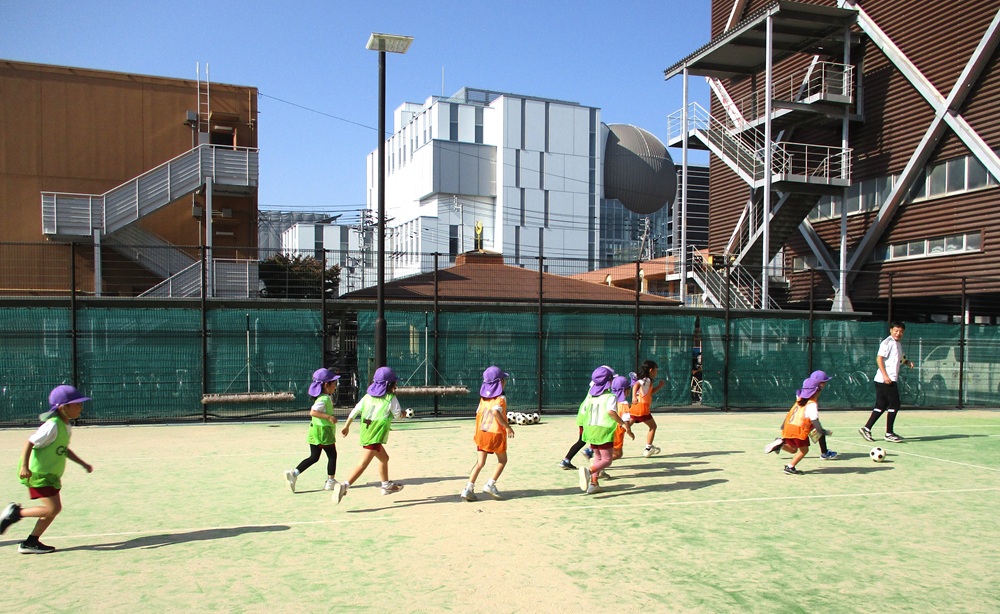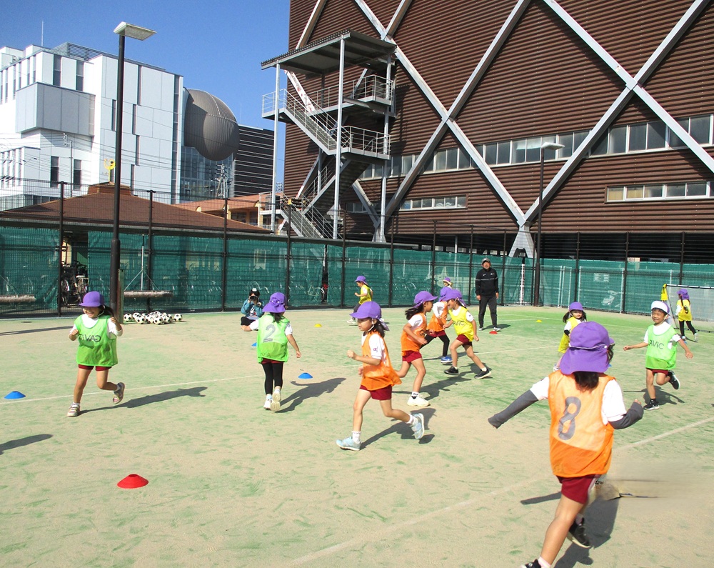 最後は、2チームに分かれてのゲーム!「絶対に勝つぞ!」と子どもたちの意気込みに圧倒されたのが2名の講師たちでした(笑)しかし、ゲームが進められていくにつれ「みんな速すぎー」とスピードについていけなくなったり、サッカーゴールの前で待ち構えシュート担当になっていたりと、子どもたちの知恵に観覧の保護者からも笑いが起こっていました。
