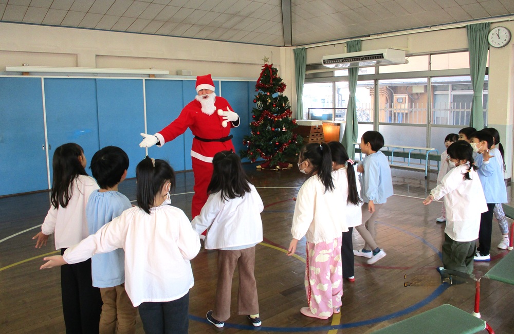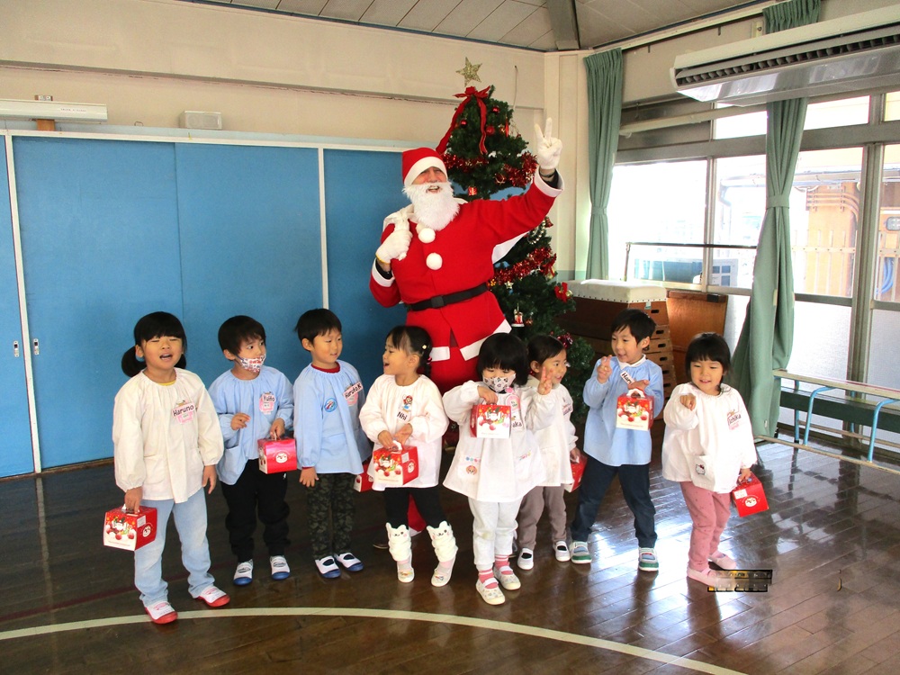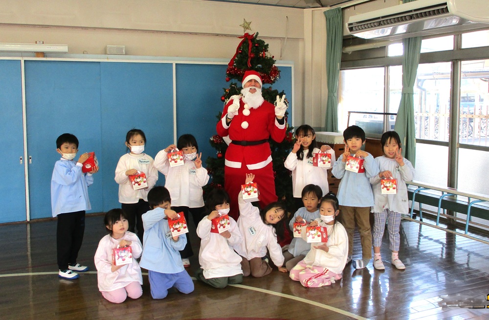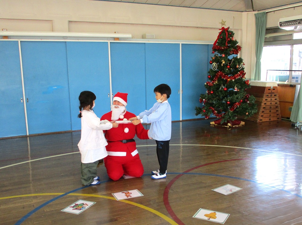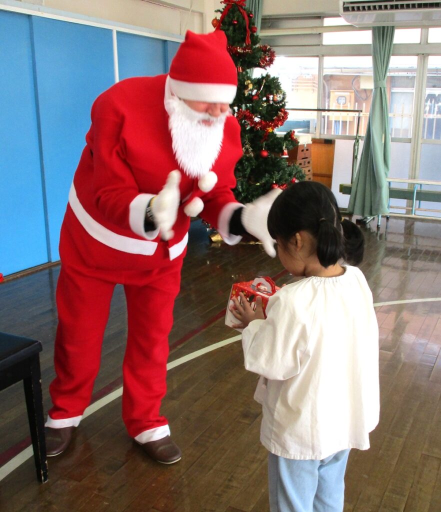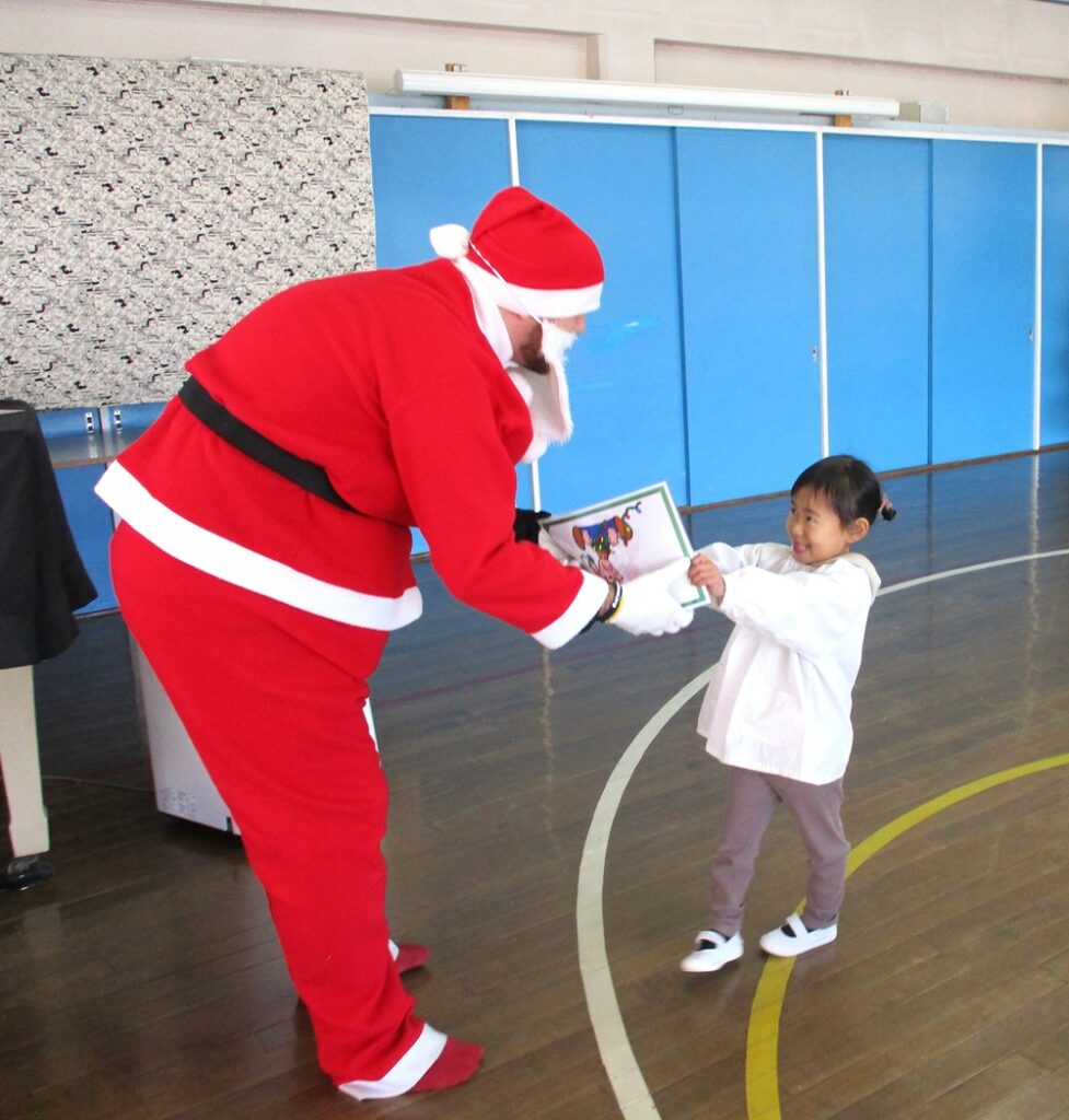 続いて、年中・年長児は、一目散にサンタクロースに抱きつき、一年ぶりの再会を喜んでいましたが、中には「マシュー先生に似てるよね」と、未だ半信半疑の子どももいてほっこりとする一コマでした。