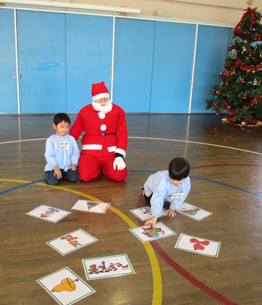 まずは、年少児から。英語教室のマシュー先生がサンタクロースに変身して登場。すぐにマシュー先生とわかった子どもたちでしたが「どうしてお腹が大きいの?」と興味津々。こっそり服の中を覗き込んだりお腹を触ったり・・・子どもたちの思いがけない逆襲に大慌てのサンタさんでした。