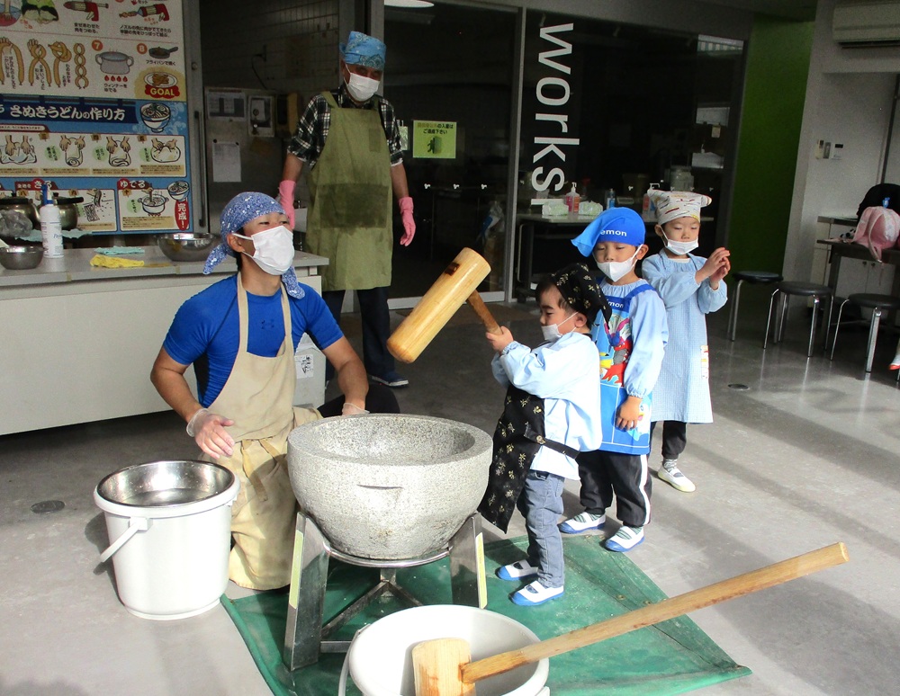 最初は施設の方がお手本を見せてくれ、いよいよ子どもたちの番です。「よいしょ、よいしょ」の掛け声にあわせて杵を振り下ろす・・・簡単そうに見えても実際に行ってみると、なかなか杵をあげることができなかったり、ゆっくり~と自分のテンポを貫いたり、しかし、何度か回数を重ねるうちに、コツをつかみ楽しくなってきたようで、進んで並び順番を待つ姿が見られるようになりました。