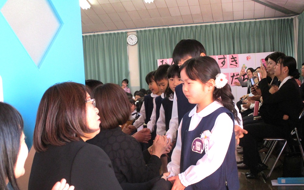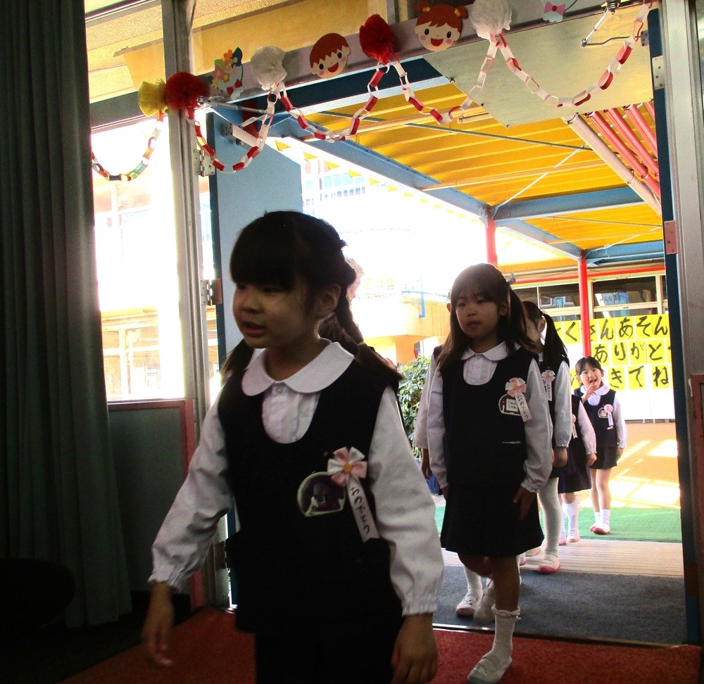 保護者と一緒に登園してきた卒園生たちは、胸に記章をつけてもらい、一気に誇らしげな表情になりました。