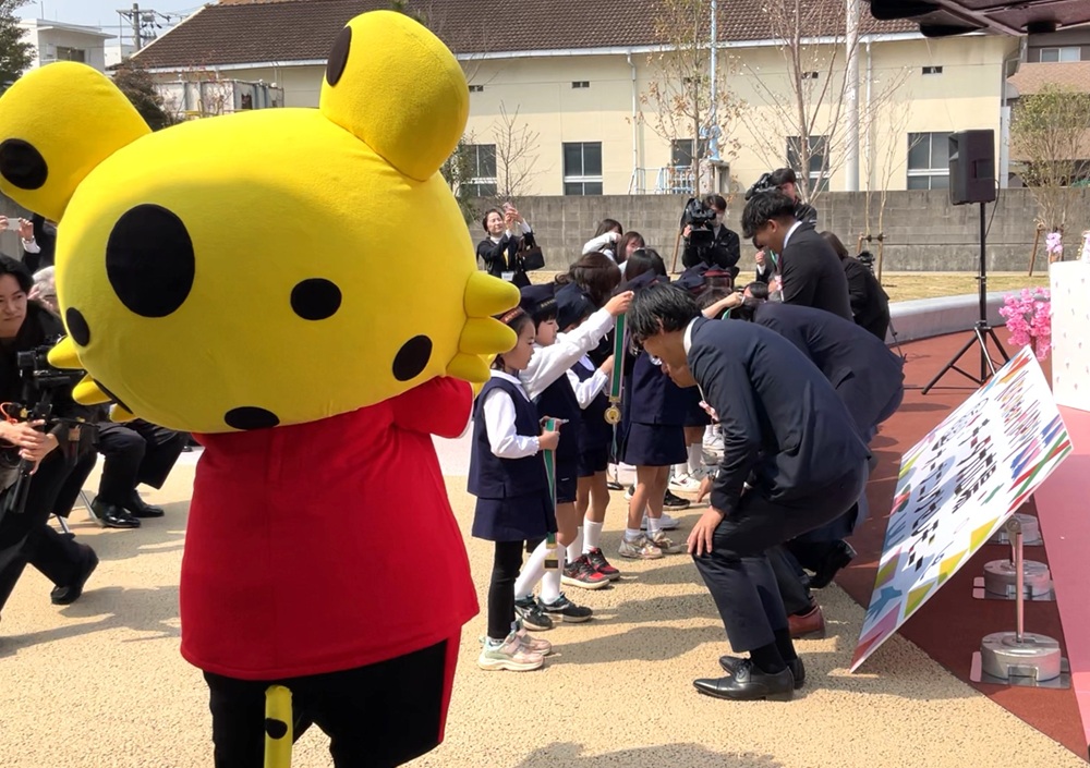 まず、チータカ広場に携わっていただいた業者の方々に、園児たちが描いたマスコットキャラクター“チータカちゃん”の絵が中心に飾られたメダルを、お礼のことばとともにお渡ししました。かわいらしいメダルに業者の方々の表情が一気に笑みに変わりました。